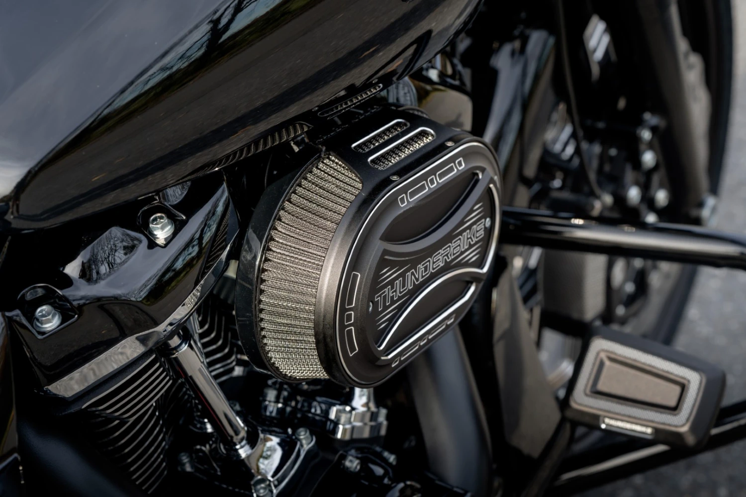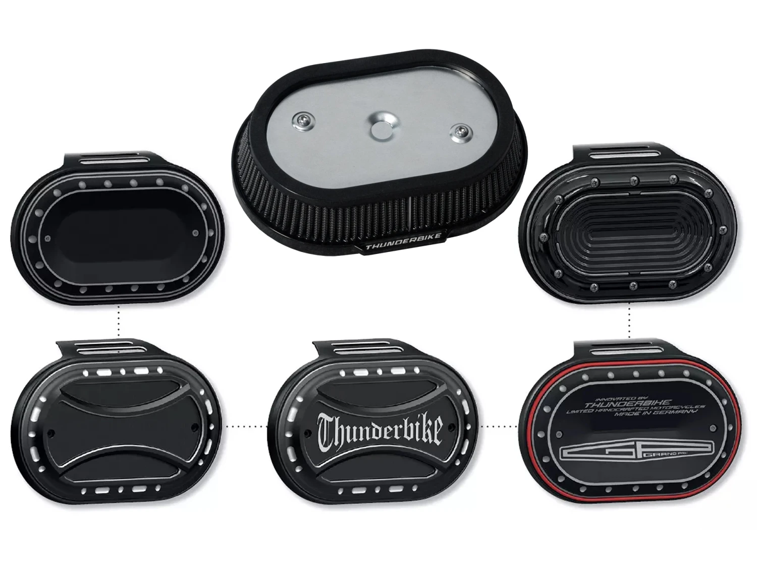 Der neue Thunderbike Luftfilter ist ein Kit zur Umrüstung auf ovale Luftfilter. Es kommt mit speziell konstruierter Grundplatte für das Manifold der Euro 5+ Motoren. Mit Zulassung für alle 117 cui Euro-5+ Modelle jedoch ausschließlich in Kombination mit Jekill & Hyde.