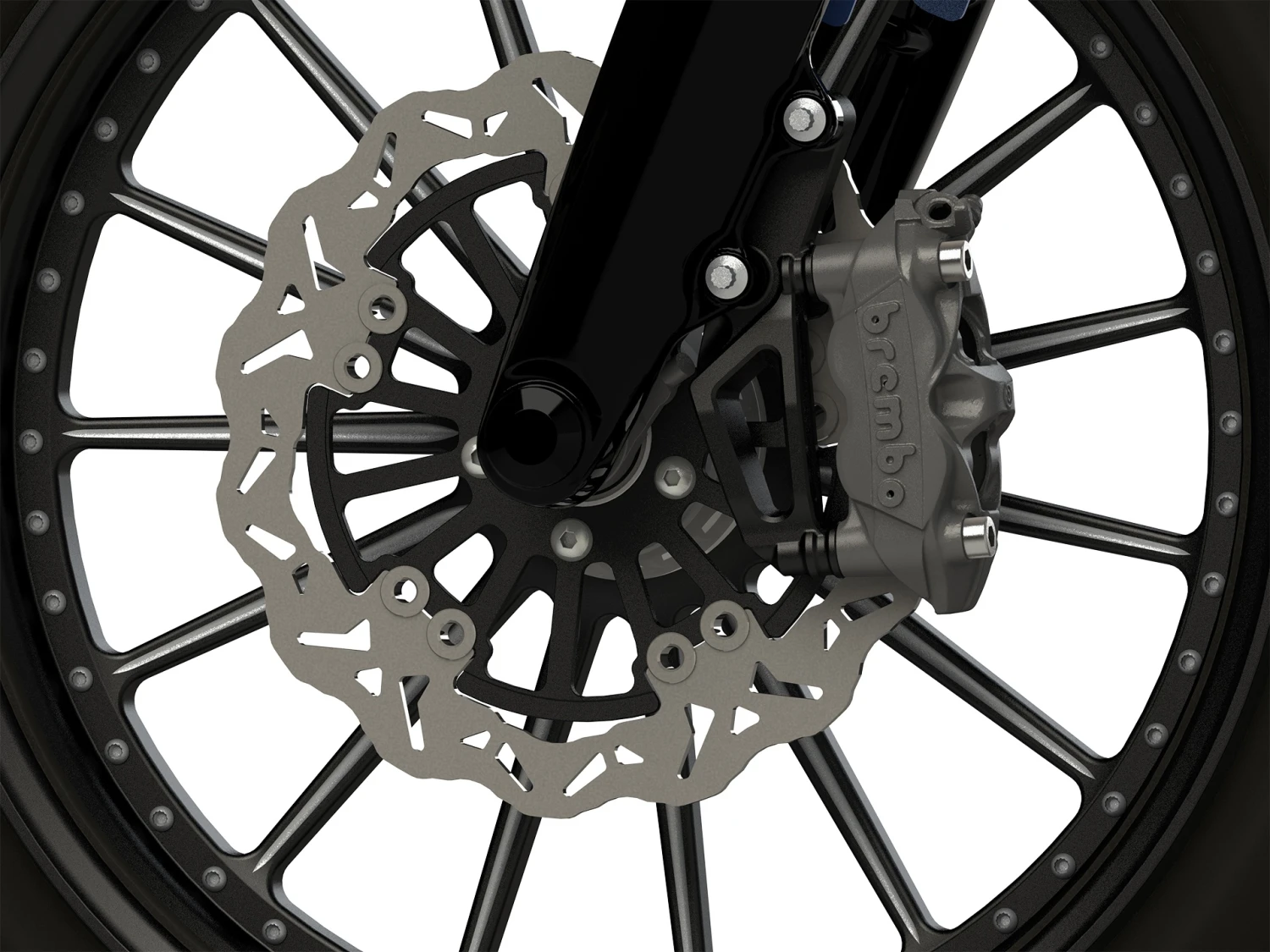 Der Thunderbike Bremssattel Adapter dient zur Montage von Bremsscheiben mit einem Durchmesser von 300 oder 340mm, in Kombination mit radialen 108 mm Brembo M4 Bremsätteln.