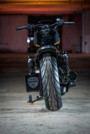 Der original Thunderbike seitliche Kennzeichenhalter sorgt für ein absolut cleanes Heck. Das mittige Kennzeichen wandert auf die linke Seite und der Blick auf den Hinterreifen wird frei.