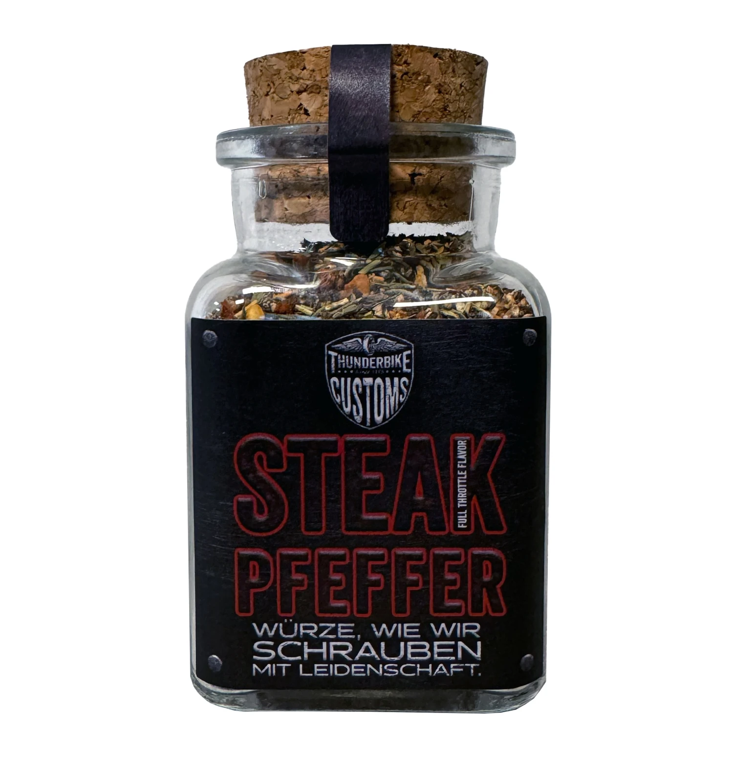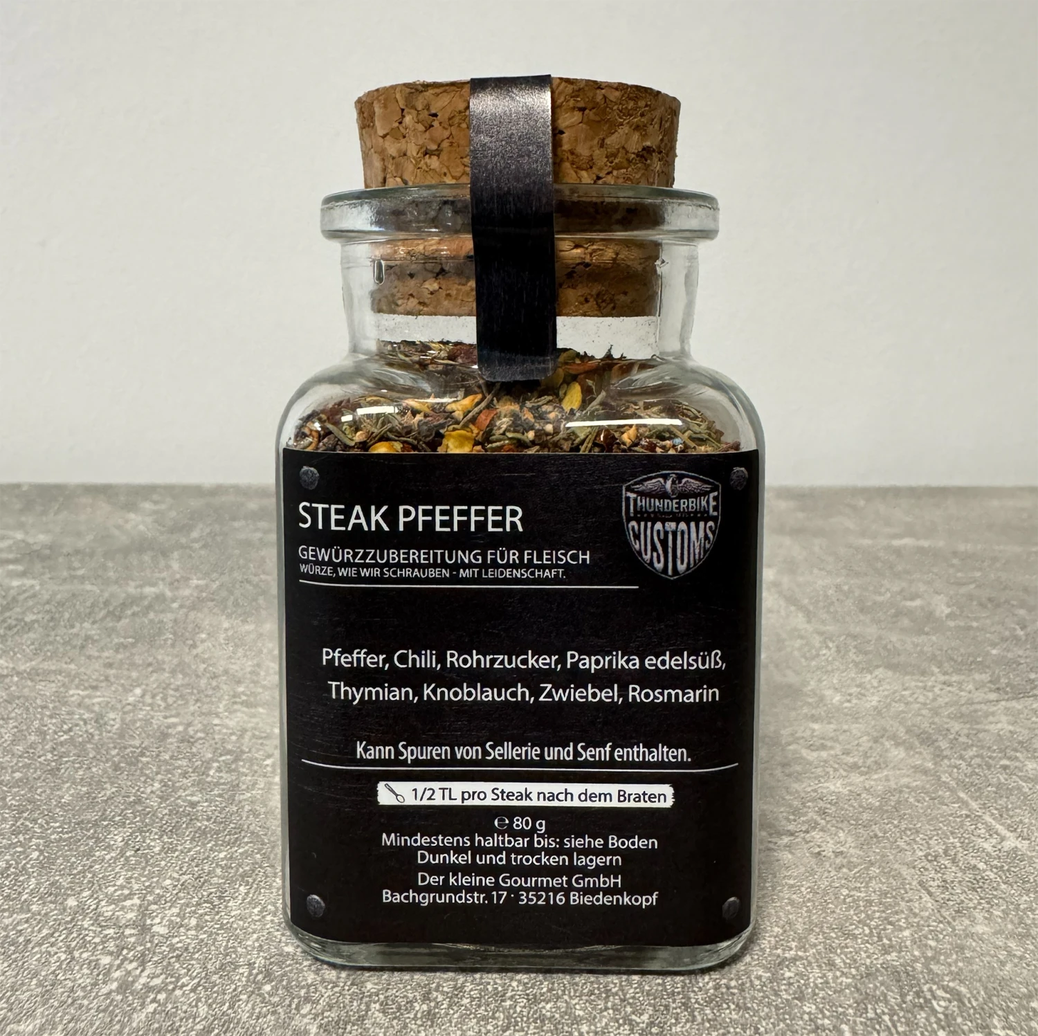 Der Thunderbike Steakpfeffer ist eine Mischung aus Pfeffer, Chili, Rohrzucker, Paprika edelsüß, Thymian, Knoblauch, Zwiebeln und Rosmarin