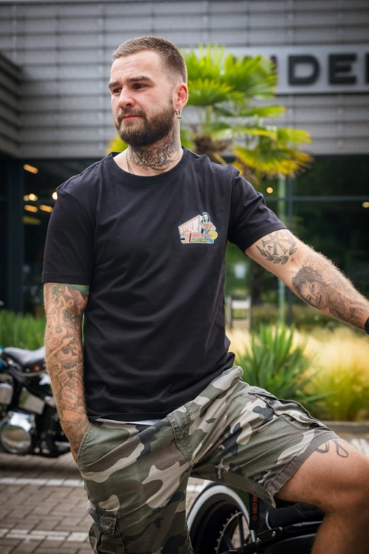 Unser limitiertes Eventshirt vom Rumble & Thunder 2025 ist das perfekte Erinnerungsstück für alle, die beim Spektakel am Thunderbike Roadhouse dabei waren oder es einfach gefeiert haben! Mit dem auffälligen Retro-Print auf dem Rücken im Stil der 50er zeigst du deine Begeisterung für Bikes, Hot Rods und Rock’n’Roll. Das Shirt ist normal geschnitten und aus angenehm weicher Baumwolle gefertigt, bequem für jeden Tag.