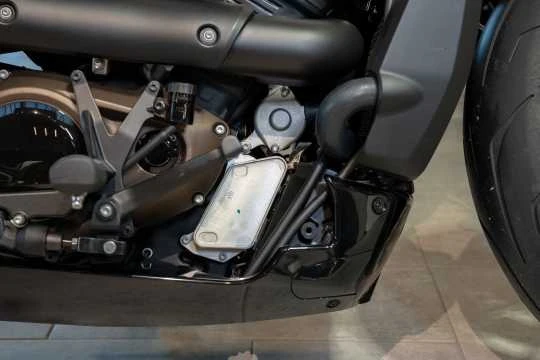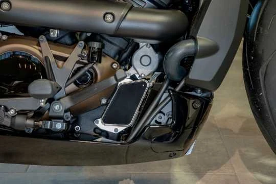 Diese schwarze Abdeckung verbirgt den Wärmetauscher unter der Fußbremse.